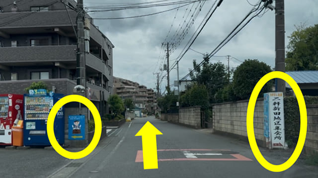 ミウラスポーツクラブさんと二軒新田集会所の看板に挟まれた道をどんどん進みます。