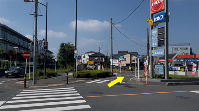 交差点(信号)をガソリンスタンド方面に渡ります。